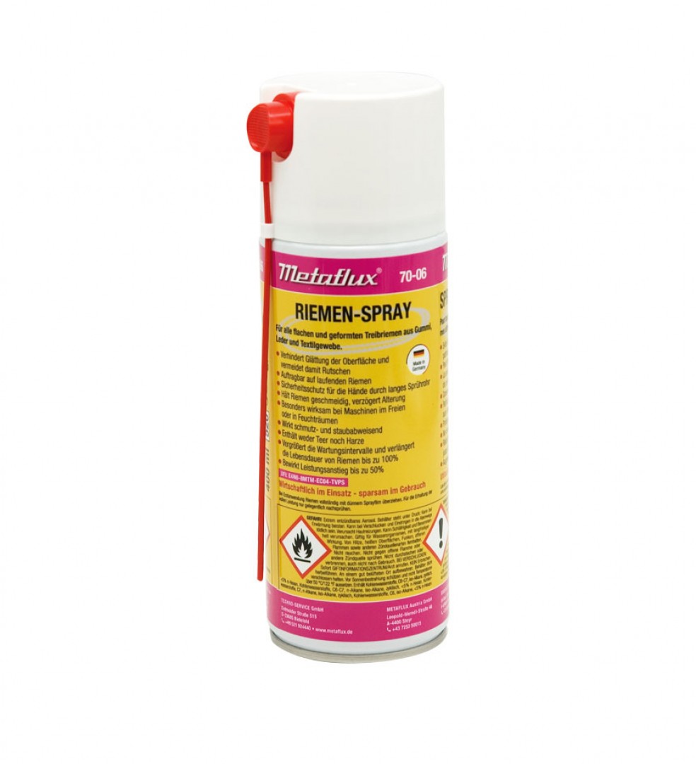 Bei laufendem Riemen direkt auf den Riemen bzw. auf die Riemenscheibe sprühen, damit sich der Wirkstoff